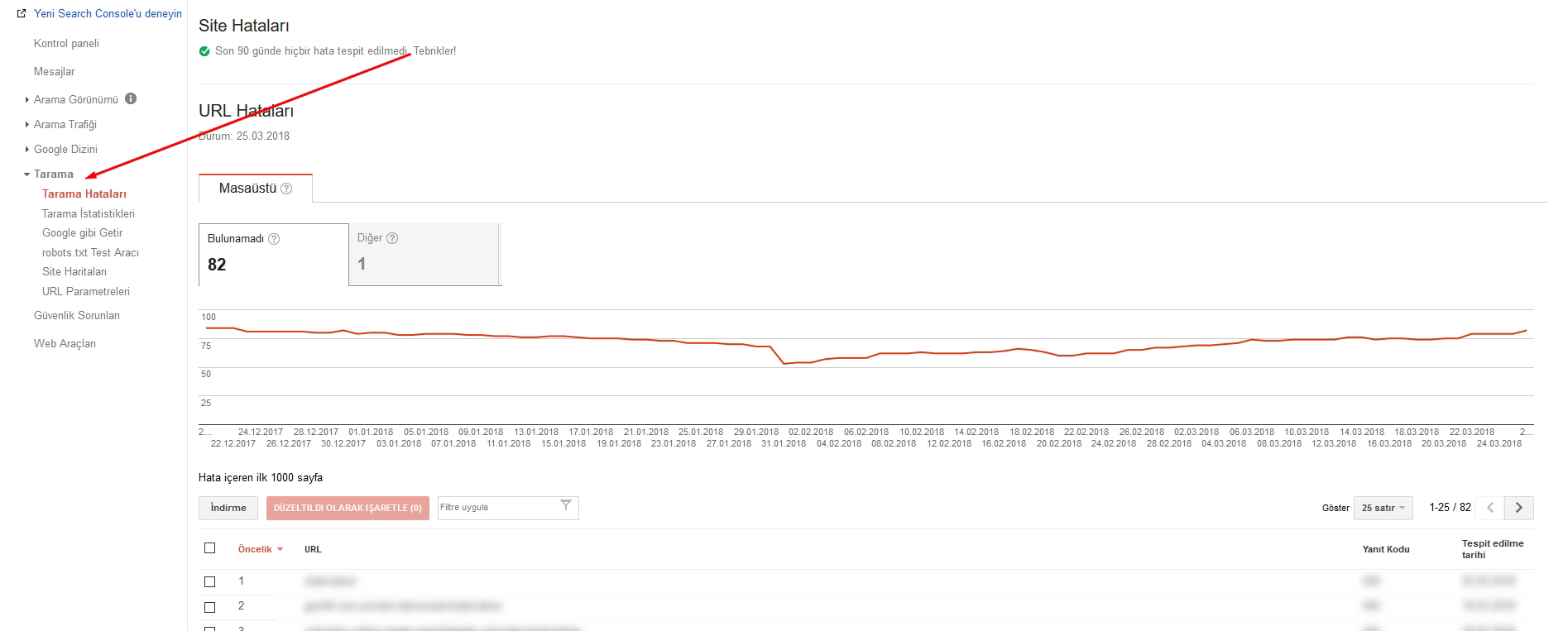 404 Hata sayfaları çok dikkat edilmesi gereken bir hata türüdür. 404 hatalarını iyi bir şekilde takip etmek ve en kısa zaman içerisinde müdahale etmek gerekiyor. 404 hatalarını en iyi şekilde tespit edebilmek için Google Webmaster Tools’ta (Yeni adıyla Search Console) “Tarama” bölümüne giriniz. Tarama bölümünün alt sekmesi olan “Tarama Hataları” bölümünde 404 hatası veren sayfalarınızı bulabilirsiniz.
